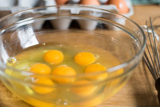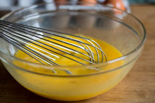 To finish the prep-work, break 7 large eggs into a medium bowl…