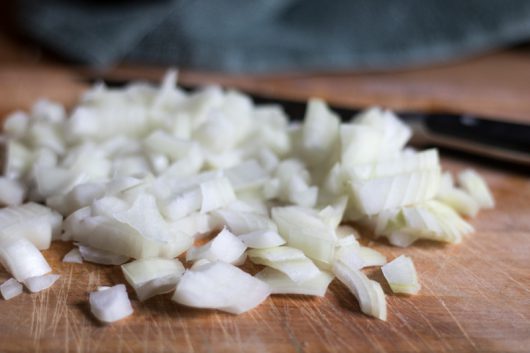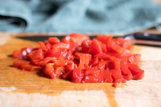 Also dice up a roasted red pepper. My pepper came from a 7.5 ounce jar.