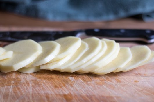 Then slice a medium-size Yukon Gold potato into 1/8-inch rounds (see video above for my nifty potato-slicing method).