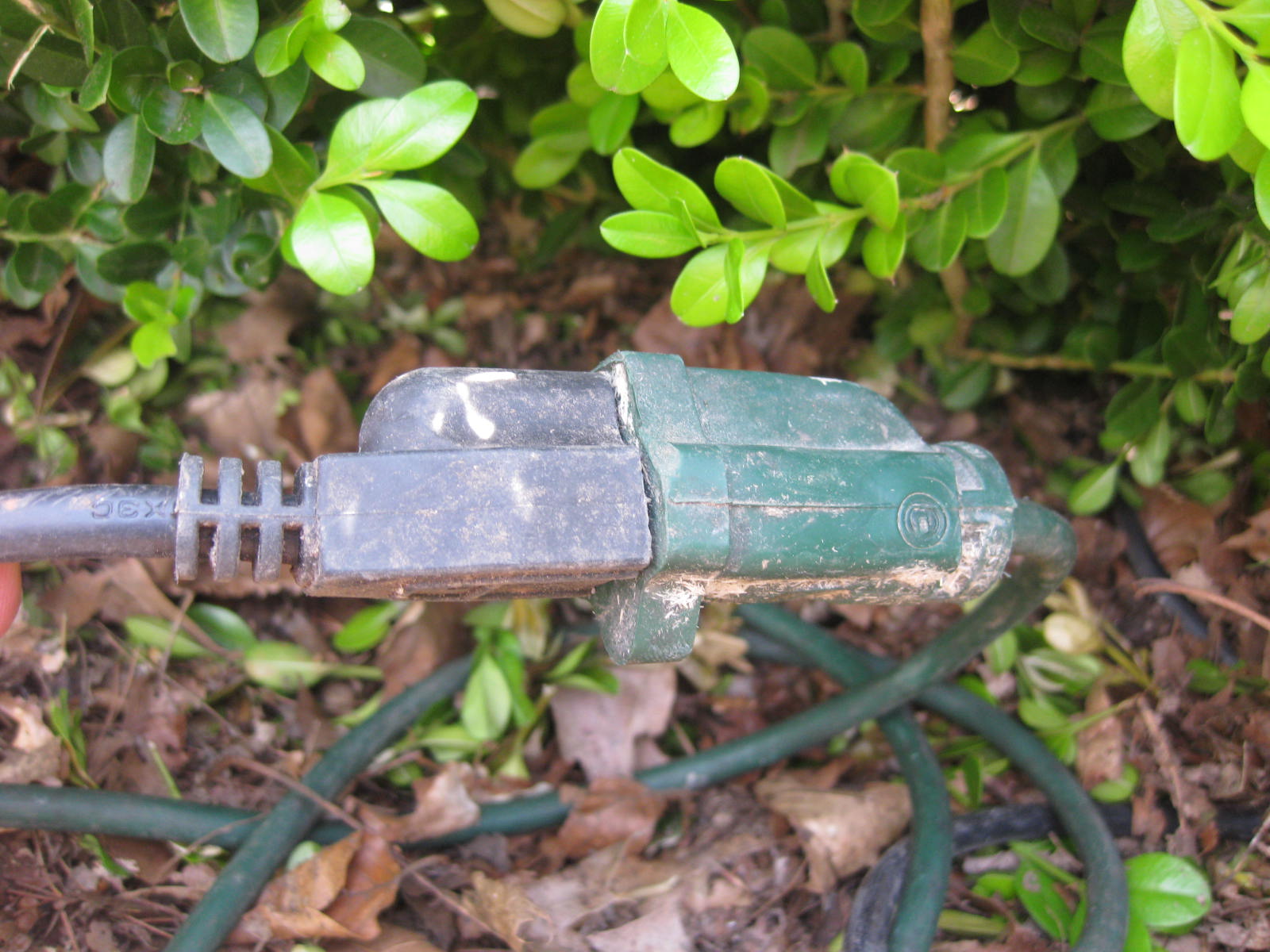 So last week, I solved the ugly-outlet-problem once and for all. I cut off the boxes and capped their cables. Then I ran the pump cord for each fountain under the brick path. The cord now emerges, out of view, behind the boxwood hedge. To provide electricity to the pumps, I buried an outdoor-grade extension cord in the lawn. No more eyesores! Now the only cringe-element is my memory of what the electrician was paid.