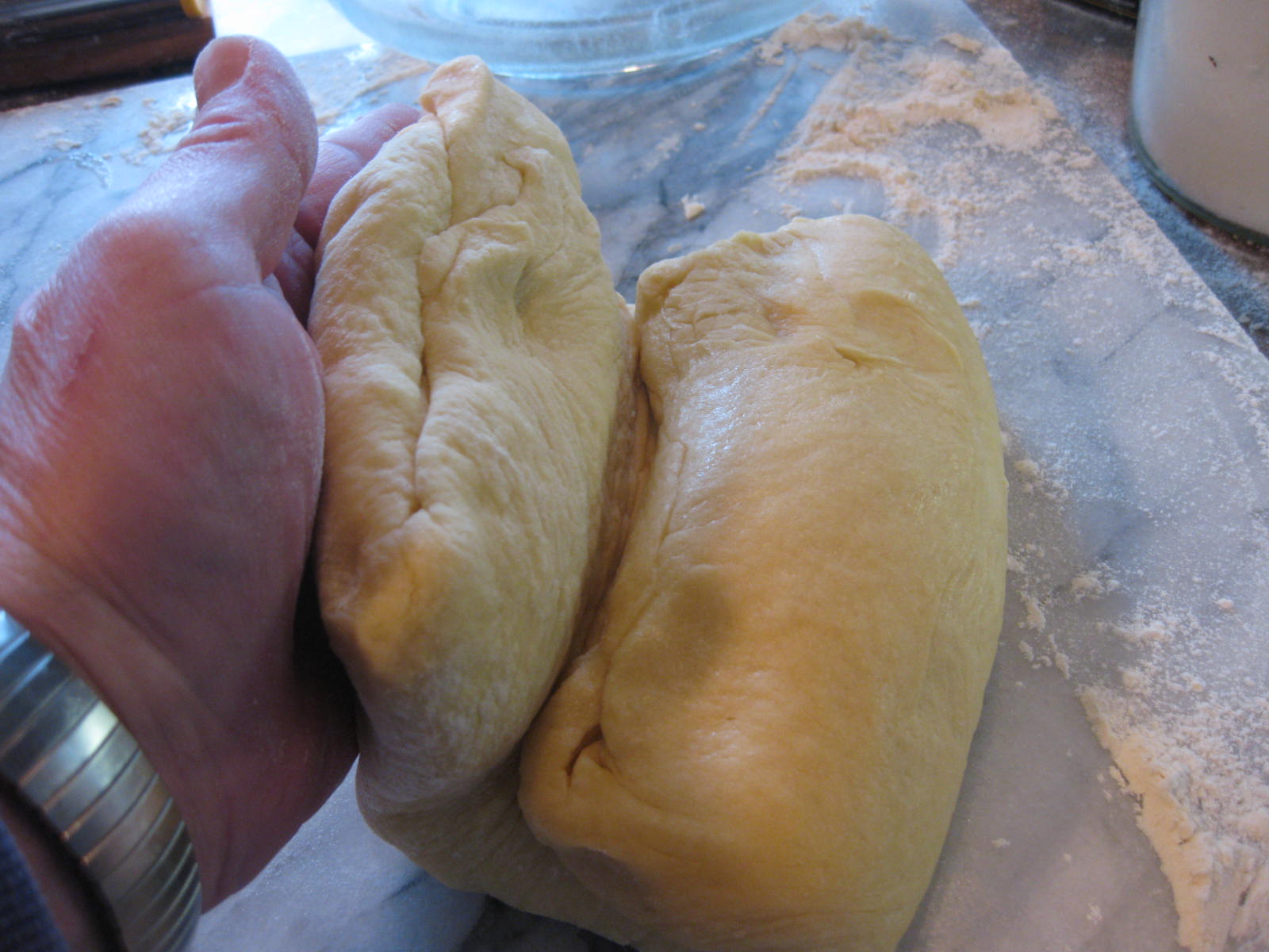 6. Turn the dough out, then pat it down into a rough rectangle. Fold the rectangle into thirds (like folding a business letter); pat it out again and repeat the folding. Return the dough to the bowl, and cover with plastic wrap. Let rise again, this time to more than double (about 2 1/2 to 3 hours).