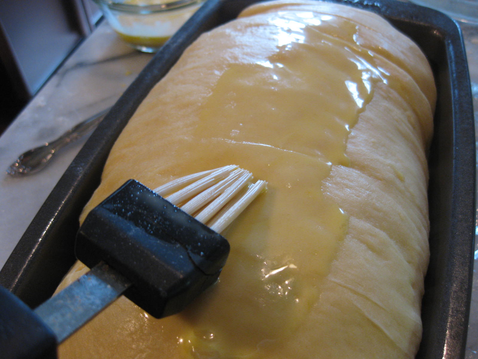 8. Just before baking (if you are baking in a regular pan, not a Pullman), lightly paint the top of the dough with an egg glaze (1 egg yolk mixed with 1 tsp milk or cream).