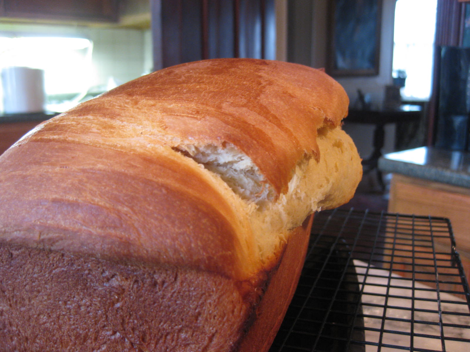 It just came out of the oven and I have a couple of questions/comments. I used a Pullman pan and the butter dripped on the tin foil in the bottom of the oven, aside from the wonderful smell and eventual smoke. Not a problem. I want to know what I did wrong here… The top and sides are sucked in, the bottom and short sides are not. Any suggestions. Can’t wait to cut in and taste.