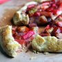 - Bake until the crust colors and the rhubarb bubbles -- 40-45 minutes. Transfer the baking sheet to a wire rack. Meanwhile, put the currant jelly in a small custard cup, and add 1/4 teaspoon water. Heat in the microwave until the jelly melts -- 30-60 seconds. Stir the mixture, then brush it all over the still-warm rhubarb. When cooled to room temperature, slide the galette onto a wooden board for easy slicing. Serve with ice cream, clotted cream, or whipped cream.