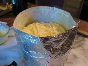 A buttered collar, made from a double-thickness of aluminum foil (one sheet folded over), keeps the souffle’s puffed top from tumbling over — and making a mess — in the oven. An ordinary pin holds the collar in place.