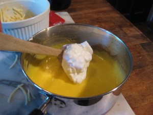 5. Scoop up a quarter of the egg whites, and quickly stir them into the bechamel sauce to lighten it. Then, make an opening in the bowl of egg whites, by pushing the whites gently to one side. Pour the bechamel into this opening. Using your rubber spatula, quickly but gently fold the egg whites into the sauce, alternating scoops of the spatula with sprinkles of Swiss cheese and the optional herbs. Don’t over-mix, or you’ll deflate your egg whites!