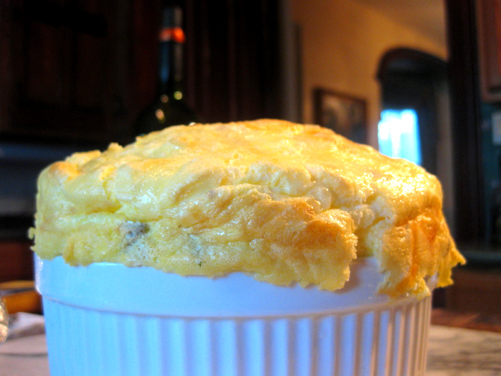 A souffle, if you’ve never made one, is little more than stiffly-beaten eggs whites folded into a thick white sauce, or “bechamel.” The egg whites expand as they heat, causing the batter rise up dramatically.