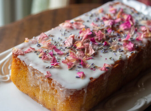 Ok – I made it, but used pea flowers from a local vineyard instead of rose petals, and made and almond glaze (confectioners sugar, half & half, almond extract) instead of the lemon glaze. Also served it with macerated strawberries. This cake is amazing.